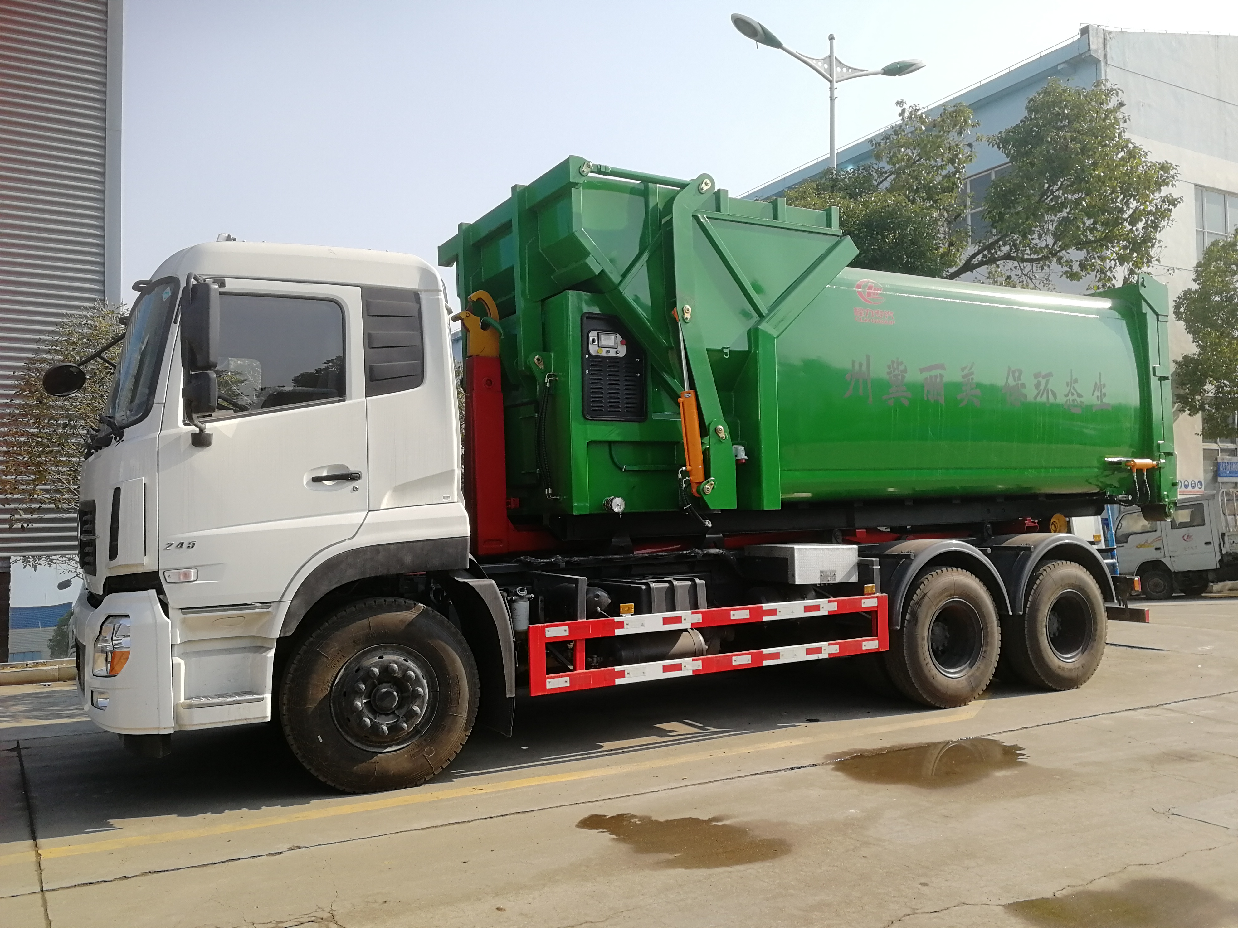 1、該車的特點是一車能配多個垃圾廂,能實現一車與多個垃圾箱聯合循環作業運輸,充分提高了車輛的運輸能力。在裝卸運輸過程中可有效地避免二次污染。整車具有結構簡單、操作方便、裝卸效率高、機械自動化程度高、節省人力的優點。拉臂系統可以將箱體自如落到地面進行垃圾裝載,然后將箱體從地面上平穩提升到車輛上,通過拉臂上裝系統鎖緊箱體來完成運輸、舉升箱體、卸料全過程。