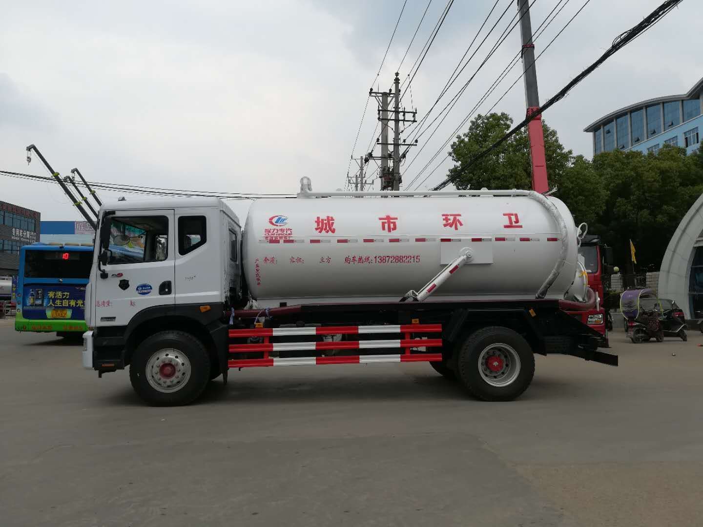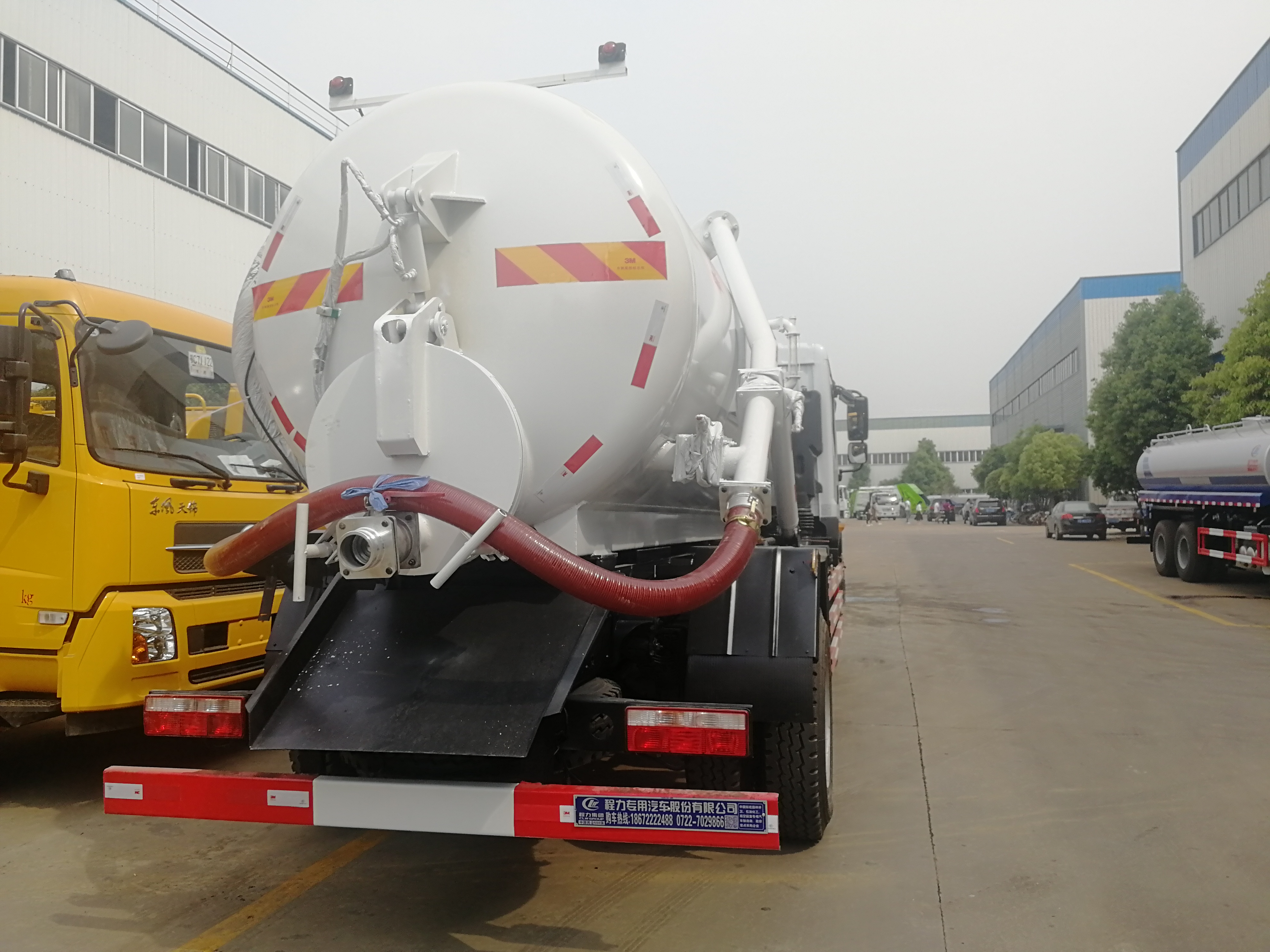風D9吸污車罐體形狀為圓柱形,采用武鋼6mm厚優質碳鋼鋼板,罐體前部帶吸污窗,洗手裝置,舉升裝置,吸污管8米一根,罐體多種顏色選擇,其余按廠內標準配置制作。隨車配置大功率真空吸污泵和優質液壓系統,罐體封頭一次壓鑄成型、罐體可后開、雙頂自卸。罐內污物可通過后蓋直接傾倒,具有真空度高(比吸糞車的吸力更大)、噸位大、效率高、用途更廣泛的特點。(垂直吸程:≥8 m,工作壓力:8500Pa,理論抽速:120L/S,軸功功率:≤13kw,進排氣口徑:50mm抽滿罐時間<5 min排滿罐時間<4min。吸污車采用大功率真空泵,一次壓鑄成型的封頭-,加厚的抗壓罐體,雙頂液壓系統,是比吸糞車功能更強大的車型。下面是山東濰坊用戶再次到湖北程力訂購12方吸污車發車圖片: