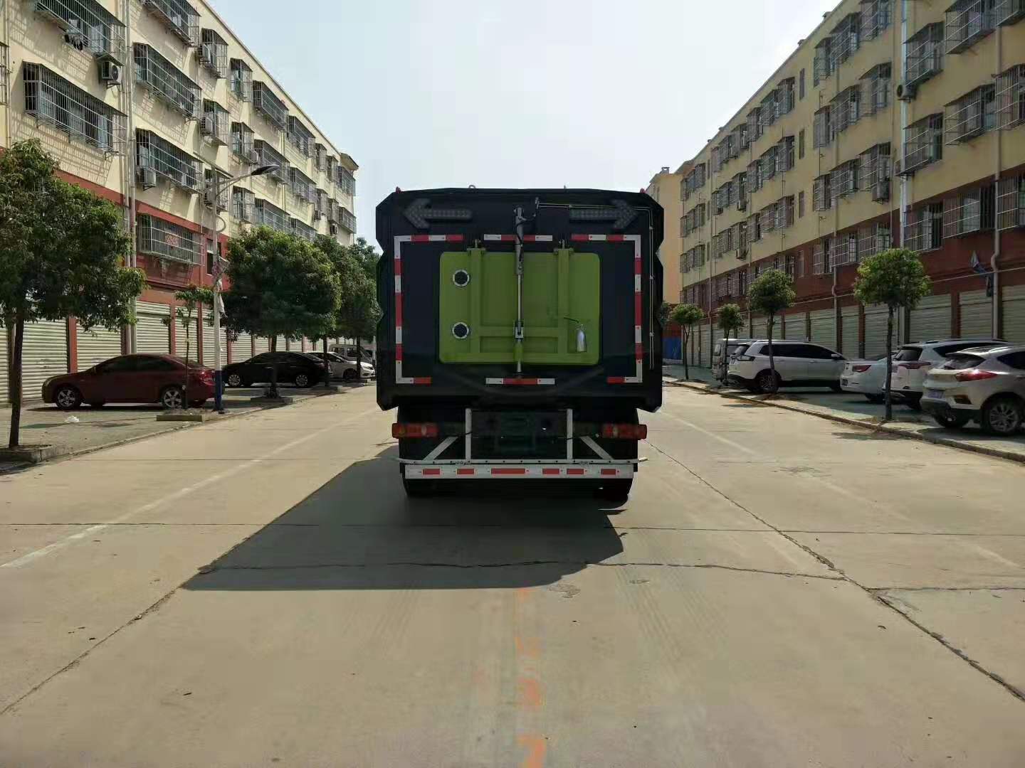 九、湖北程力專汽18噸東風天錦洗掃車的污水箱內采用大平面斜坡結構,最大卸料角度可達50度,更易于傾倒垃圾。污水箱內設置了防溢滿報警裝置和高壓噴淋清洗裝置,防溢滿報警裝置可防止污水作業時從吸管溢出,造成二次污染;高壓噴淋清洗裝置在傾倒垃圾后可對污水箱進行自動清洗,大大減輕了操作人員的勞動強度。