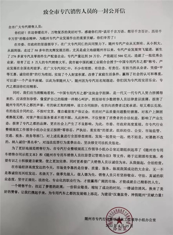 湖北隨州專汽銷售行業(yè)整頓公開(kāi)信,誠(chéng)信為本從我做起合法經(jīng)營(yíng)