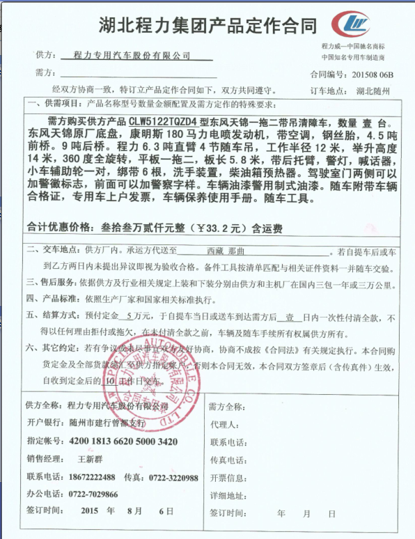 程力公司的產品從國內遠銷國外,經營活動中交易形式多樣化。近日,有銷售人員來法律事務部進行咨詢,張經理現在有個老客戶要訂購一批車子,問在簽訂合同時,經雙方協商一致,但沒有寫進合同的部分,法律上是否有效?我們給張經理解釋,口頭承諾沒寫成書面如果一方不認可是無效的。我們建議張經理,為避免今后糾紛,合同內容要盡量詳細,履行期限、貨款金額、付款方式等內容要盡可能涉及到,若有其他特殊約定可以備在合同里或簽訂一份補充協議。下面是湖北程力汽車股份有限公司汽車銷售合同模板,簡稱(湖北程力程力專汽)銷售合同模板。
