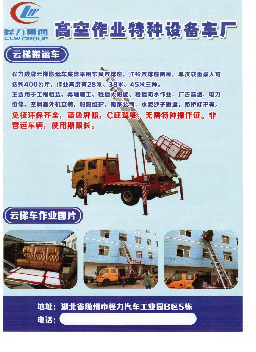 湖北程力程力威牌云梯搬家車作業高度可達28米,云梯從韓國進口,底盤有東風雙排座和慶鈴鈴雙排座兩種可選擇。