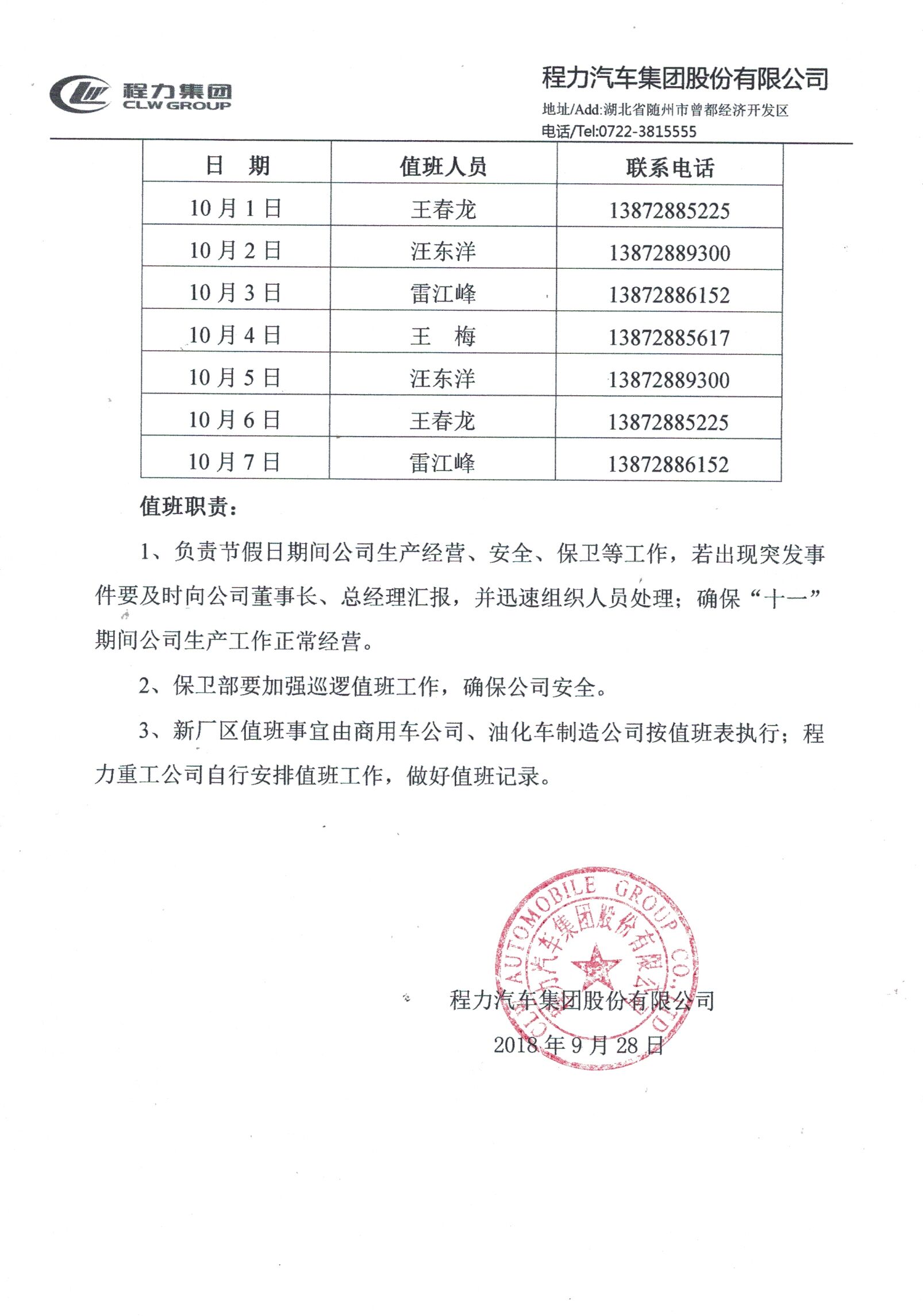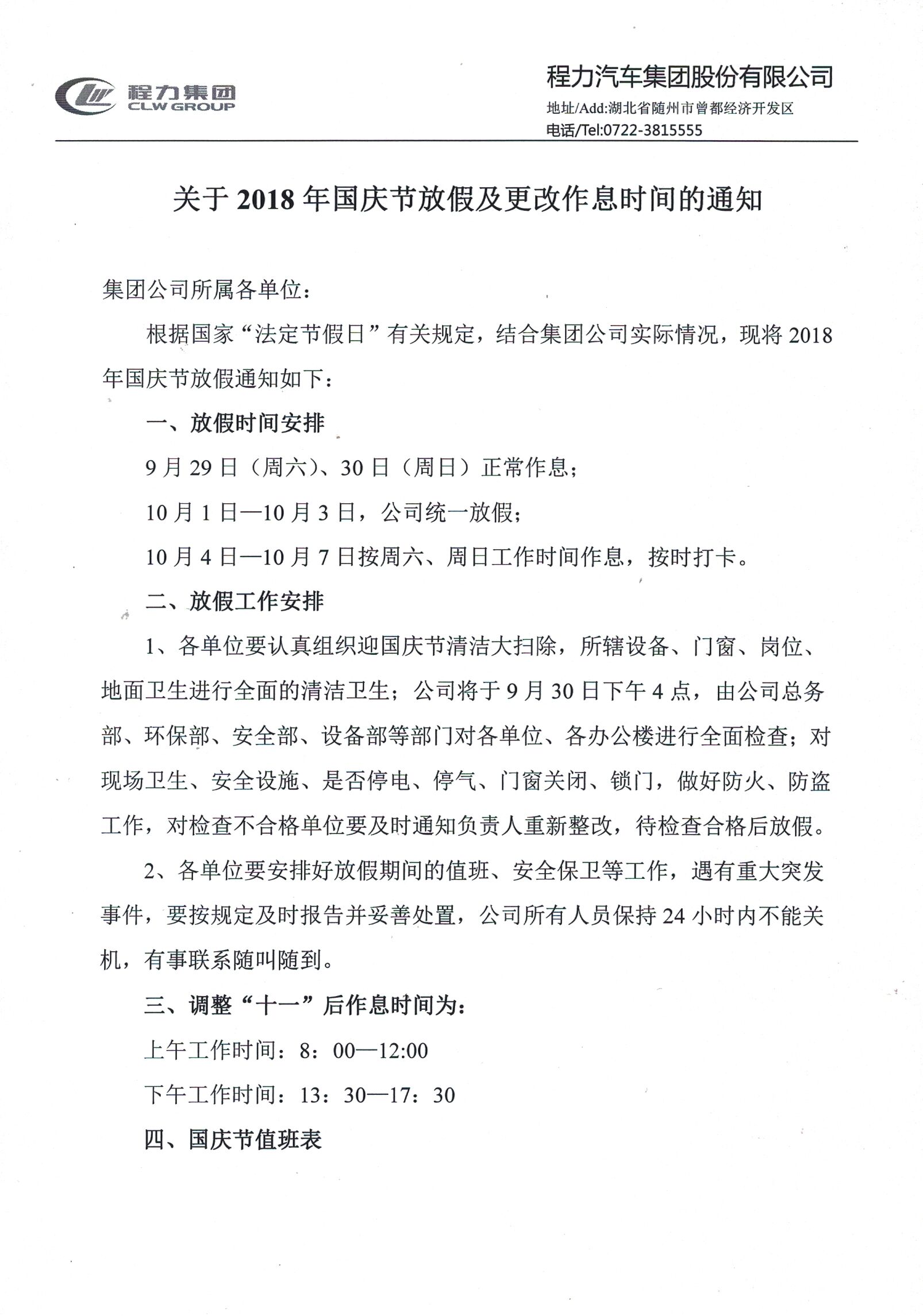 湖北程力公司2018年“國慶節”放假值班人員安排及更改作息時間的通知 :