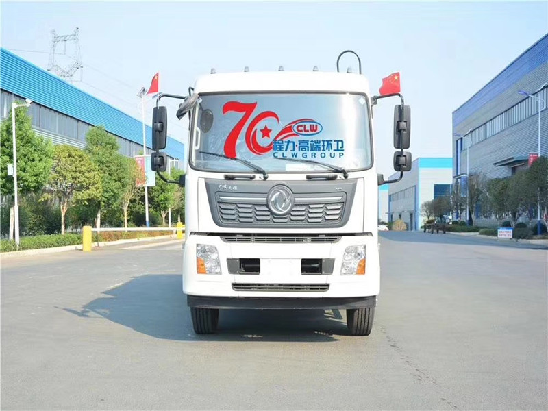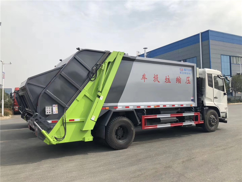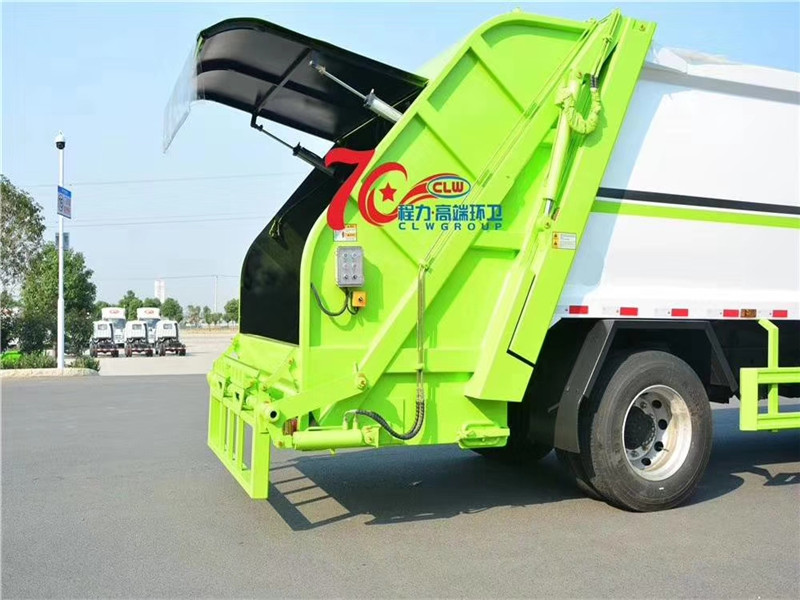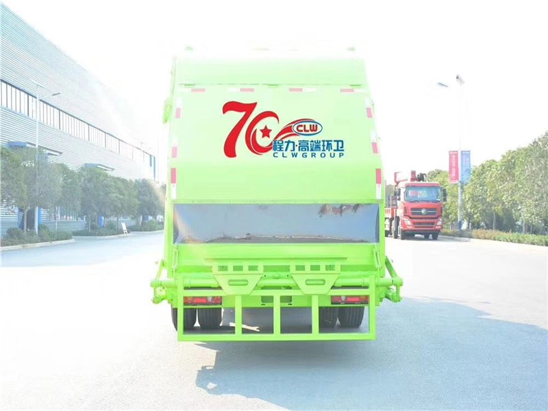 專用部分主要技術特點及產品描述: 1.垃圾箱:采用加強梁和鋼板焊接而成牢固的框架結構,實際容積最大為12-14立方,外形美觀,重量輕, 受力好,不變形;推鏟由鋼管骨架和折面板構成,不僅結構輕巧,又能使垃圾均勻分布,卸料干凈徹底;填裝器主要由填裝器殼體、滑板、刮板等構件組成,各構件采用受力良好的梁板或箱型結構,結構牢固,重量輕;為了提高使用壽命,對箱體進行了磷化防銹處理,并噴涂防銹底漆。2.液壓系統:利用電控和液壓控制的優點,通過控制轉換,保證了各機構動作準確可靠,提高了使用可靠性和效率;采用了先進的液壓舉升安全回路。其原理是在液壓系統中的舉升油缸上設置了單向平衡閥。該閥隔斷了舉升油缸與液壓膠管的直接連接,即使油管爆裂,填裝器也不會突然落下造成惡性事故,提高了使用安全性。3.裝卸方式:箱體尾部翻轉架帶翻桶(斗)機構裝卸,不會對操作人員造成污染。4.垃圾箱與填裝器之間采用特制橡膠條密封,密封性好,杜絕了二次污染。 湖北程力汽車國六東風天錦12-14方壓縮垃圾車多方位圖片展示: