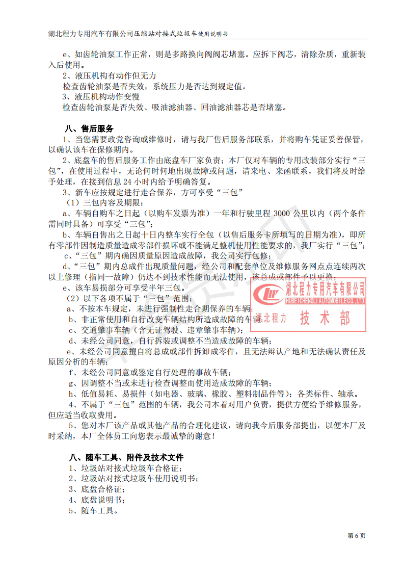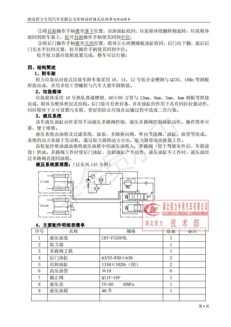 湖北程力垃圾壓縮站對接式垃圾車使用操作說明書