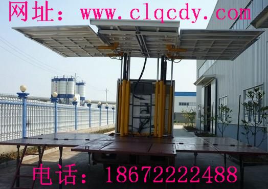 右側外板及頂板右側通過液壓舉升至與臺面垂直位置,形成遮陽、擋雨、燈光固定的頂棚及廣告的承載面。