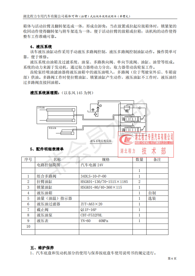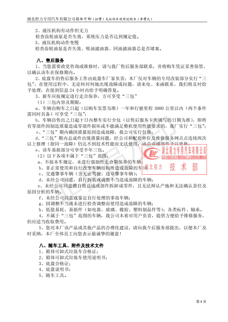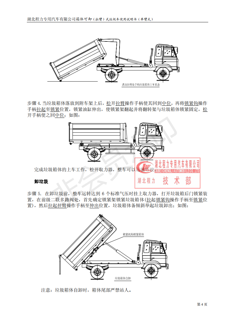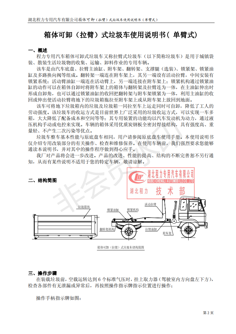 湖北程力車廂可卸式勾臂垃圾車使用說明書