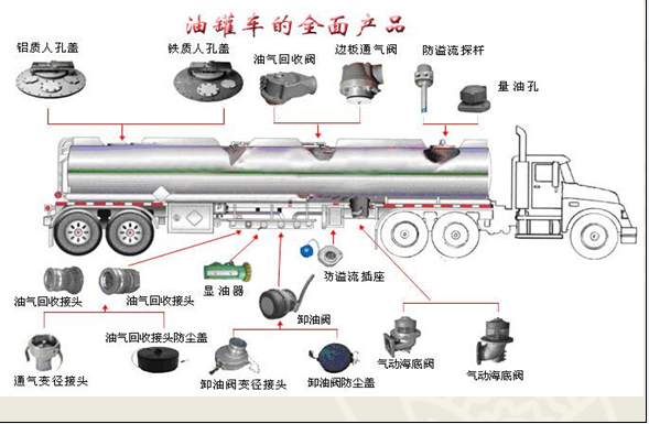 (1)海底閥:又稱緊急切斷閥,安裝于罐體底部,進(jìn)行下裝加油時(shí)使用,在油罐發(fā)生意外時(shí),由于斷槽處于無(wú)法承載過(guò)大沖力,車體管路與罐體會(huì)自動(dòng)斷開(kāi),而自動(dòng)對(duì)中柱塞和耐用彈簧會(huì)依舊保持密封,罐內(nèi)介質(zhì)不會(huì)泄漏,從而保證油罐安全。 (2)油氣回系統(tǒng):①油氣回收閥:是將在裝卸油料時(shí)所產(chǎn)生的油氣回收的一種裝置,可以直接安裝在油罐車頂部罐體上,避免了油氣外泄。 ②油氣回收接頭:罐車油氣回收系統(tǒng)組成一個(gè)封閉的循環(huán)系統(tǒng),有效的將在油站加油過(guò)程中產(chǎn)生的油氣回收再利用,避免了油氣擴(kuò)散