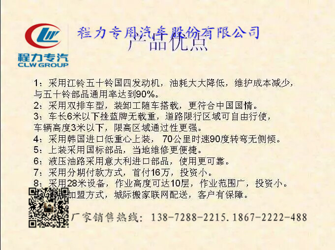 程力公司程力威牌云梯搬家車作業高度可達28米,相當于10層樓高,云梯車的承載貨物重量每次可達300公斤,藍色牌照,C證駕駛室,無需特種操作證。非營運車輛,使用期限30年。云梯從韓國進口,底盤有東風雙排座江鈴雙排座兩種供用戶選購。廠家銷售熱線:0722-3220988.0722-7029866