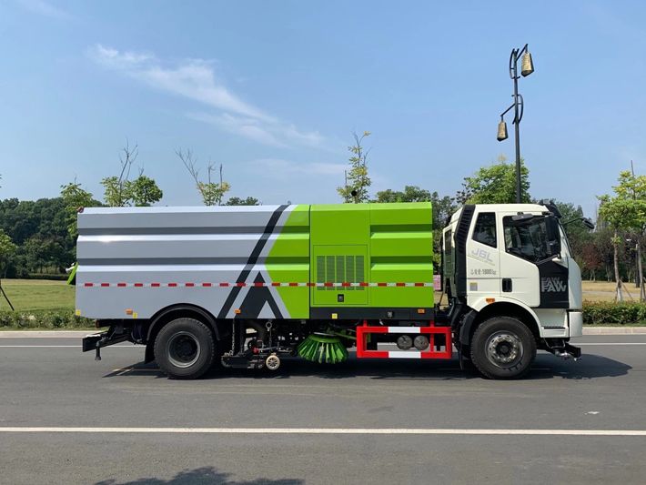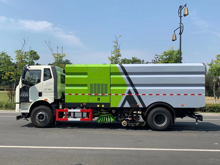 帶2個中置掃盤;中置超寬吸嘴;雙層吸塵筒; 康明斯170馬力副發(fā)動機;臺灣液壓閥;大力馬達;德國高壓水泵 (前沖/側(cè)噴/中噴/后噴霧)/側(cè)沖洗水槍/垃圾箱自潔裝置); 萬向高壓路沿清洗;威龍低壓泵(前沖),氣動球閥控制; 4mm不銹鋼垃圾箱;不銹鋼水箱;德國控制器;尾部箭頭燈; 機油、垃圾箱、水箱均帶防溢或低位報警裝置;倒車及洗掃狀態(tài)室內(nèi)監(jiān)視器; 多種語音提示;倒車自動保護、防傾倒垃圾翻車保護、檢修安全保護; 20m高壓沖洗卷盤;刷臂轉(zhuǎn)動機構(gòu)使用德國進口高新耐磨工程隔套,免打黃油; 冷彎無縫液壓油管;運動控制器一鍵電腦控制。洗掃寬度3.5m;吸入粒度p110mm。 湖北程力國六解放洗掃車多方位圖片: